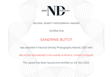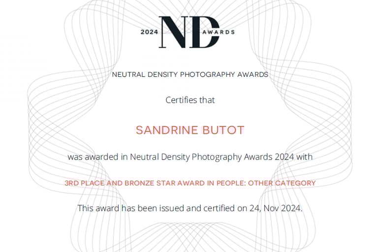 Je m'appelle Sandrine Butot et je suis photographe portraitiste. L’Art a sa place dans mon quotidien depuis toujours. Dessin, peinture, musique, écriture, créations manuelles… Tous ces outils me servent aujourd’hui dans ma pratique photographique. Diplômée à l’échelle européenne, je participe régulièrement à des concours en France et à l’étranger ; cette année, j’ai été sélectionnée dans l’équipe de France pour la Coupe du monde de photographie, et l’une de mes séries a été élue 9 ème de sa catégorie au rang européen.